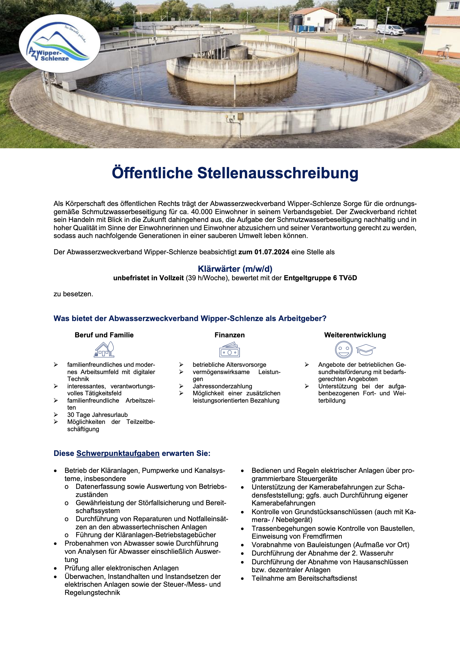 Der Abwasserzweckverband Wipper-Schlenze beabsichtigt zum 01.07.2024 eine Stelle als