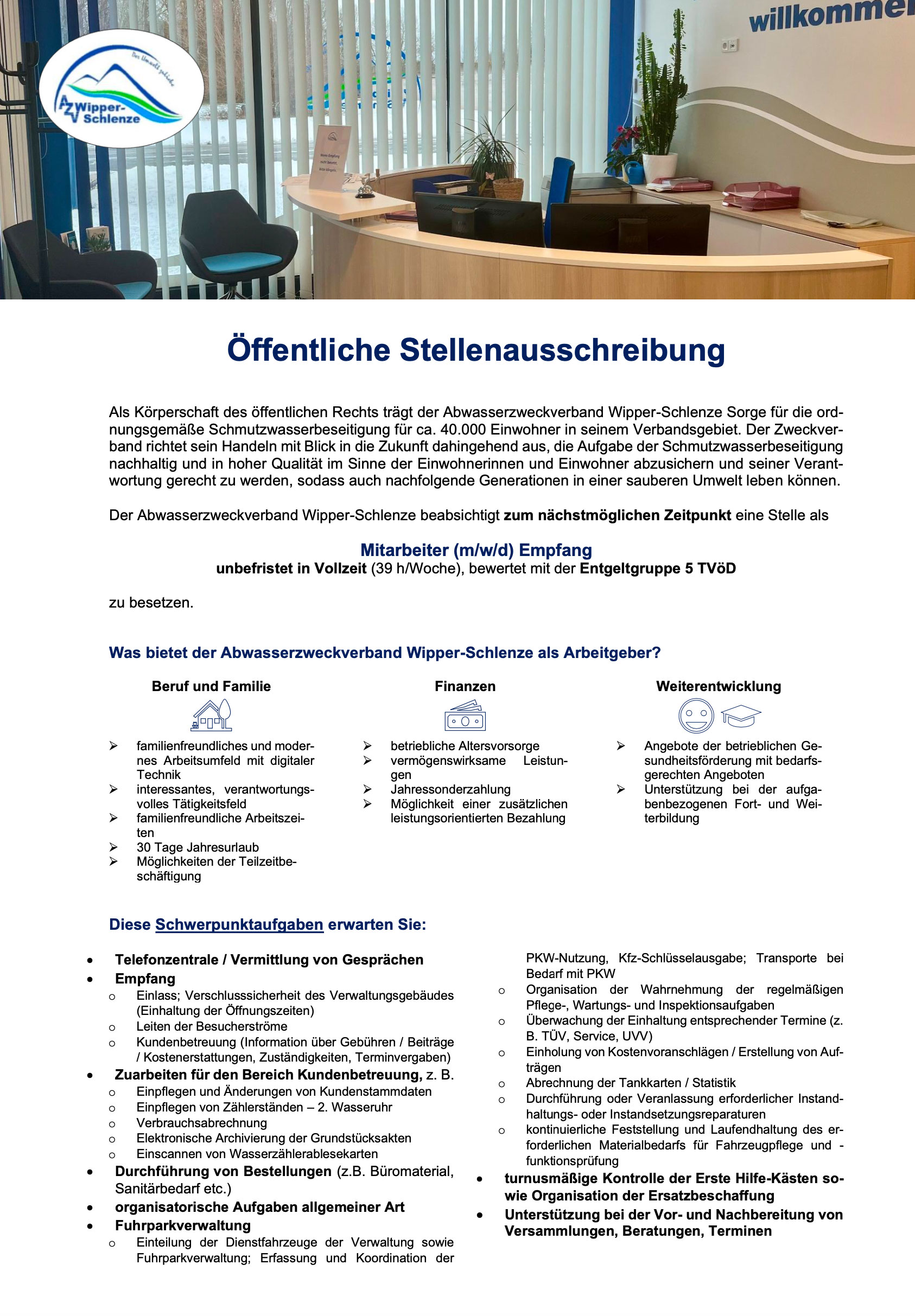Der Abwasserzweckverband Wipper-Schlenze beabsichtigt zum nächstmöglichen Zeitpunkt eine Stelle als
