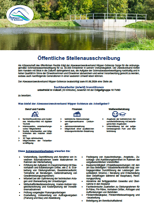 Der Abwasserzweckverband Wipper-Schlenze beabsichtigt zum 01.06.2024 eine Stelle als