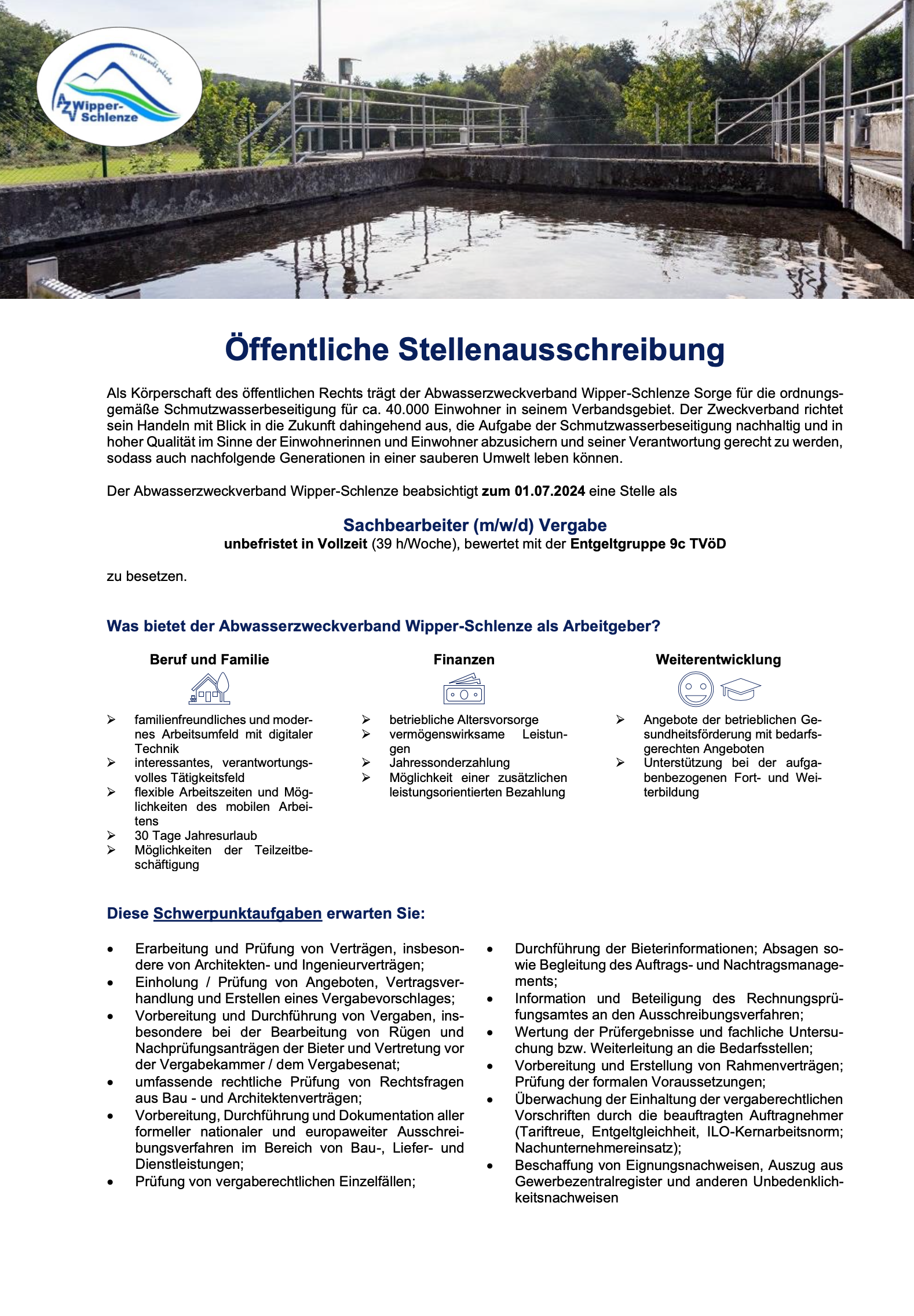 Der Abwasserzweckverband Wipper-Schlenze beabsichtigt zum 01.11.2024 bzw. zum nächstmöglichen Zeitpunkt eine Stelle als