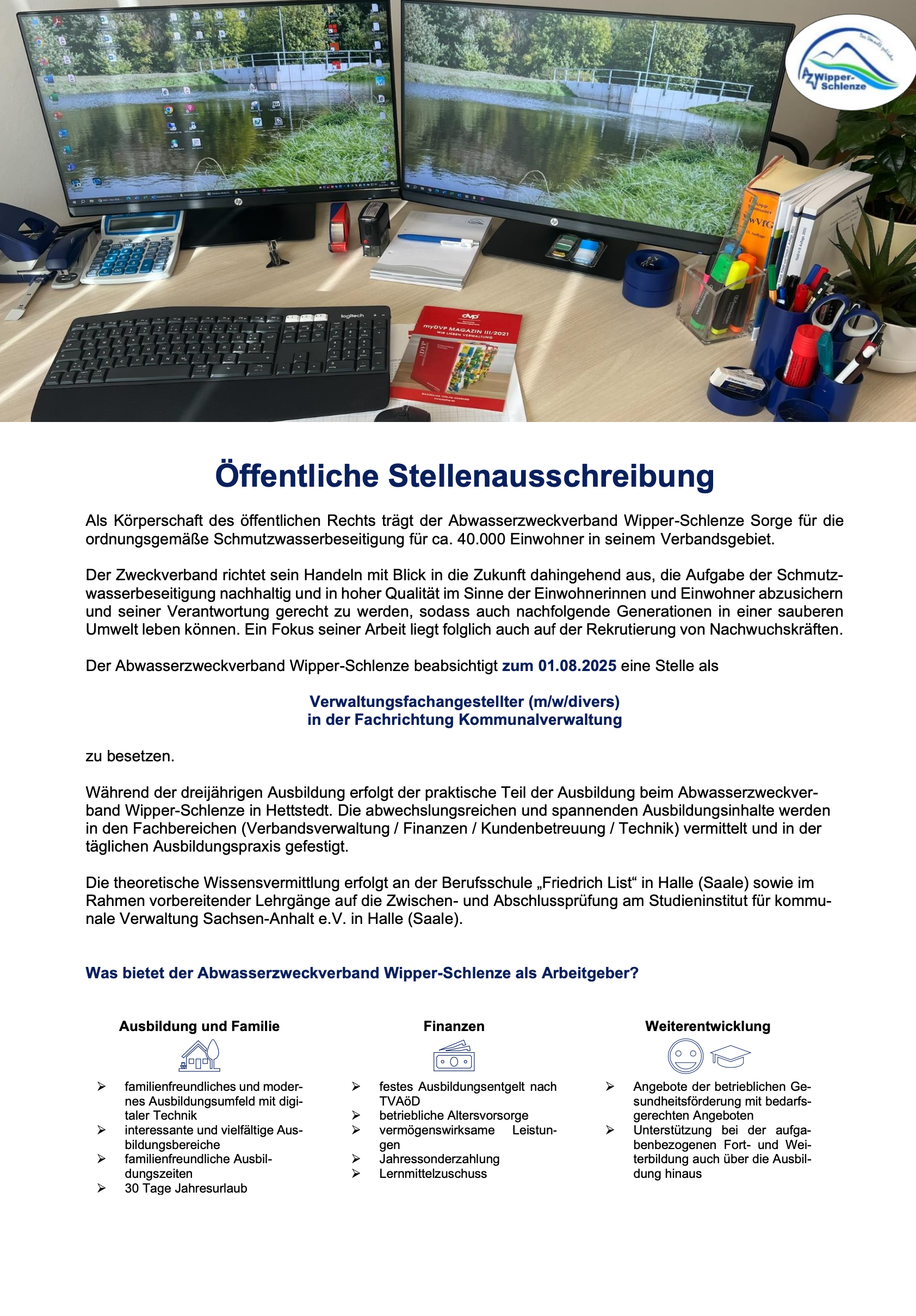 Der Abwasserzweckverband Wipper-Schlenze beabsichtigt zum 01.08.2025 eine Stelle als